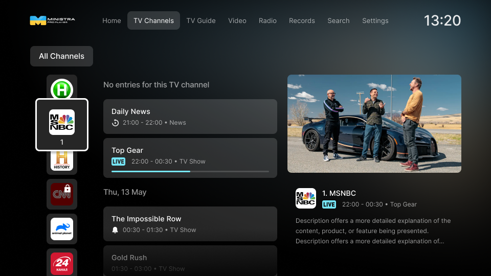 The TV Channels classic template, ideal for large-screen applications, displays the following: